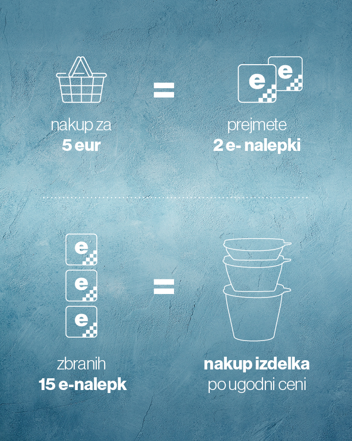 Obstaja možnost, da bo določen izdelek pred potekom akcije razprodan, zato se za nakup odločite pravočasno. Izdelki so nabavljeni izključno za namen te aktivnosti in ne bodo na voljo po njenem zaključku. Akcija je namenjena le fizičnim osebam in ne velja za pravne osebe ali samostojne podjetnike (d. o. o., s. p. idr.). Popusta za izdelke programa zvestobe ni mogoče uveljaviti hkrati s popustom za celotni nakup, Pika kupone, popustom za izbrane izdelke ali katerim koli drugim popustom. Vse cene so v EUR z vštetim DDV. Slike so simbolne.